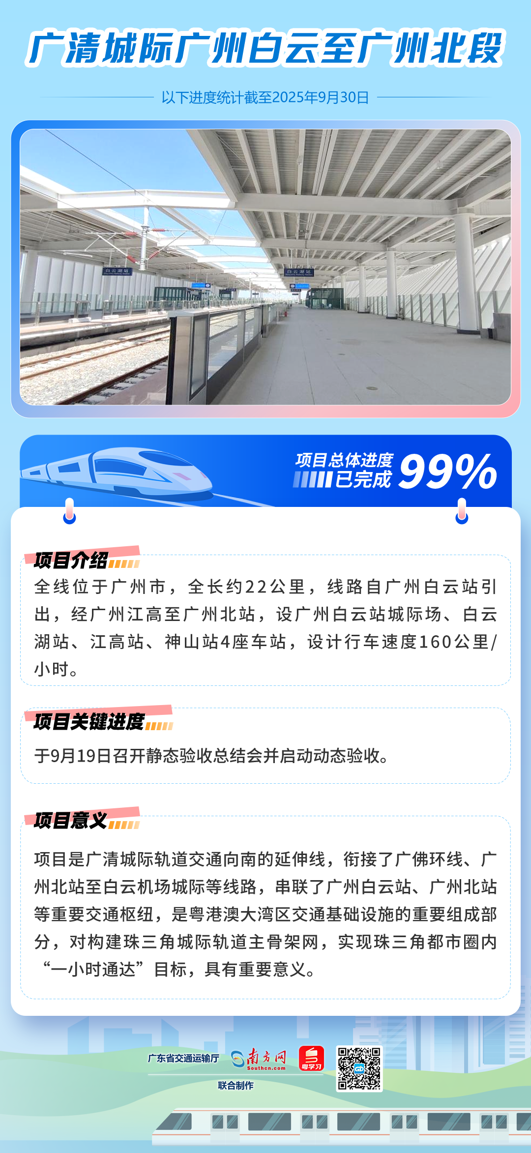 本次热滑试验范围覆盖广清城际南延线全线,正线双线全长约22公里。试验于天窗点内进行,列车自花都站(广州北站)附近出发,途经神山站、江高站、白云湖站,最终抵达广州白云站城际场。经检测,受电弓与接触网弓网关系良好、取流稳定,车体运行平稳,无打弓、拉弧、过热等现象,各项技术指标均符合设计规范及运营安全要求。